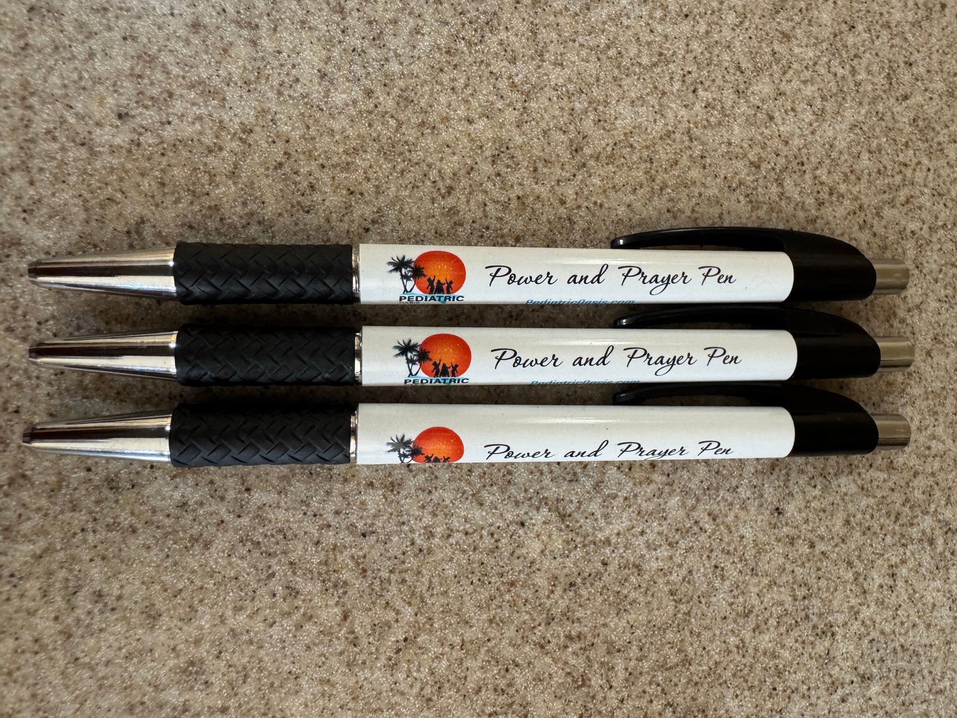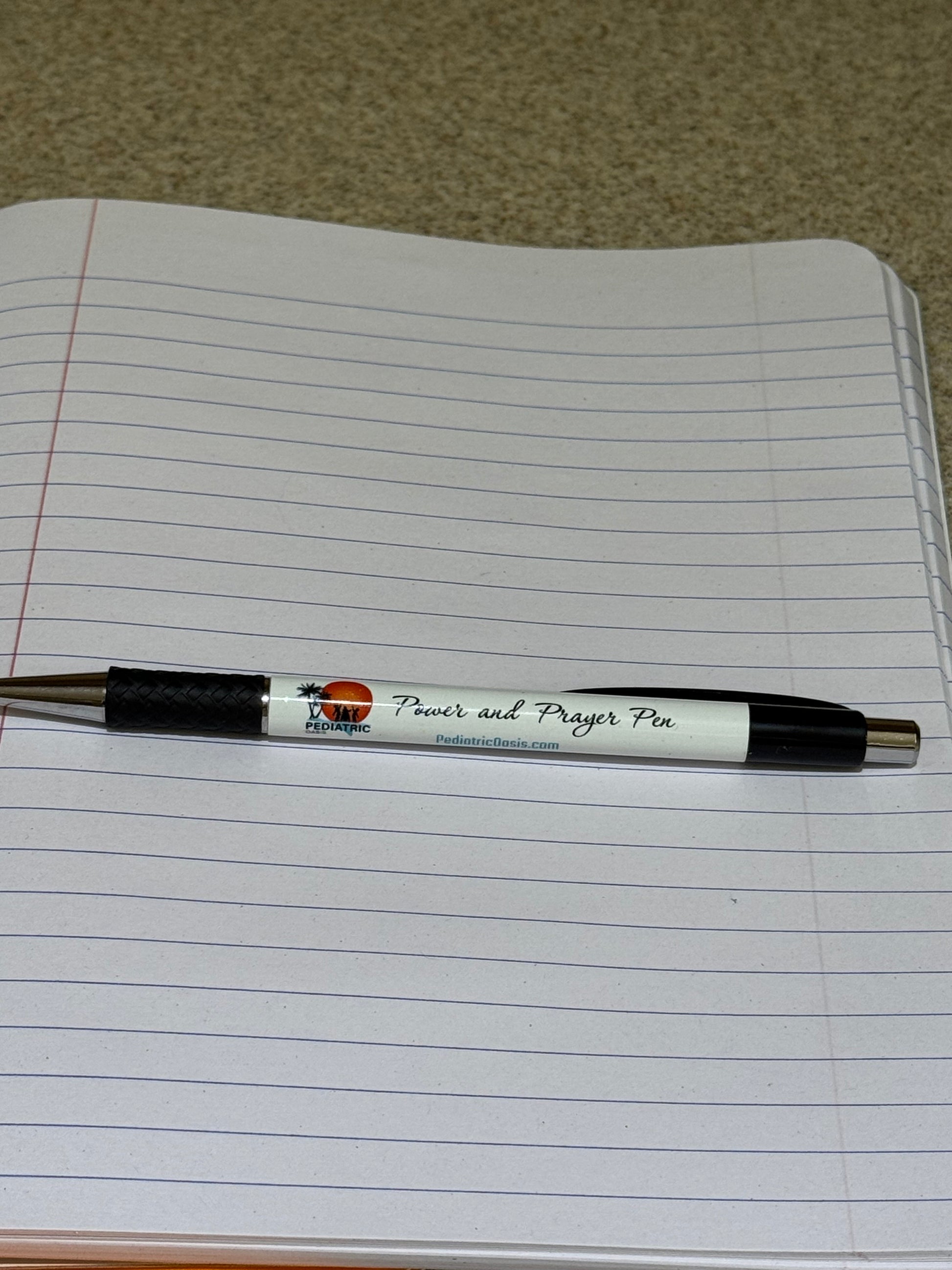 Are you looking for the perfect writing utensil to meet your every writing need? Well look no further, because this Power and Prayer Pen is a special design for inclusion with the Pediatric Oasis logo, black ink and a smooth glide. Great for daily use at office, home, and school!
